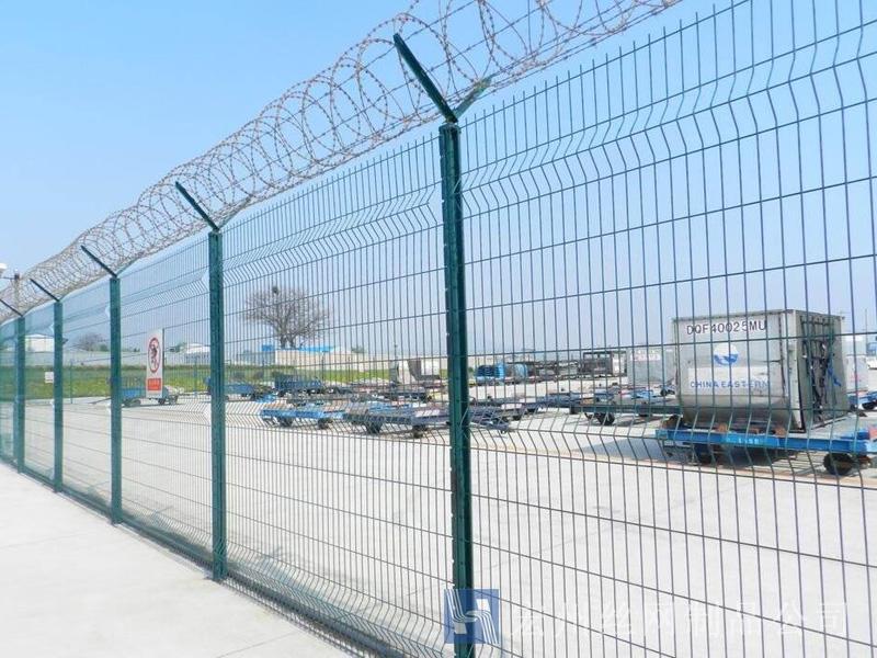 機(jī)場圍欄網(wǎng)由低碳鋼絲焊接而成的網(wǎng)片、立柱、刺鐵絲(可選)、斜撐(可選)連接而成。